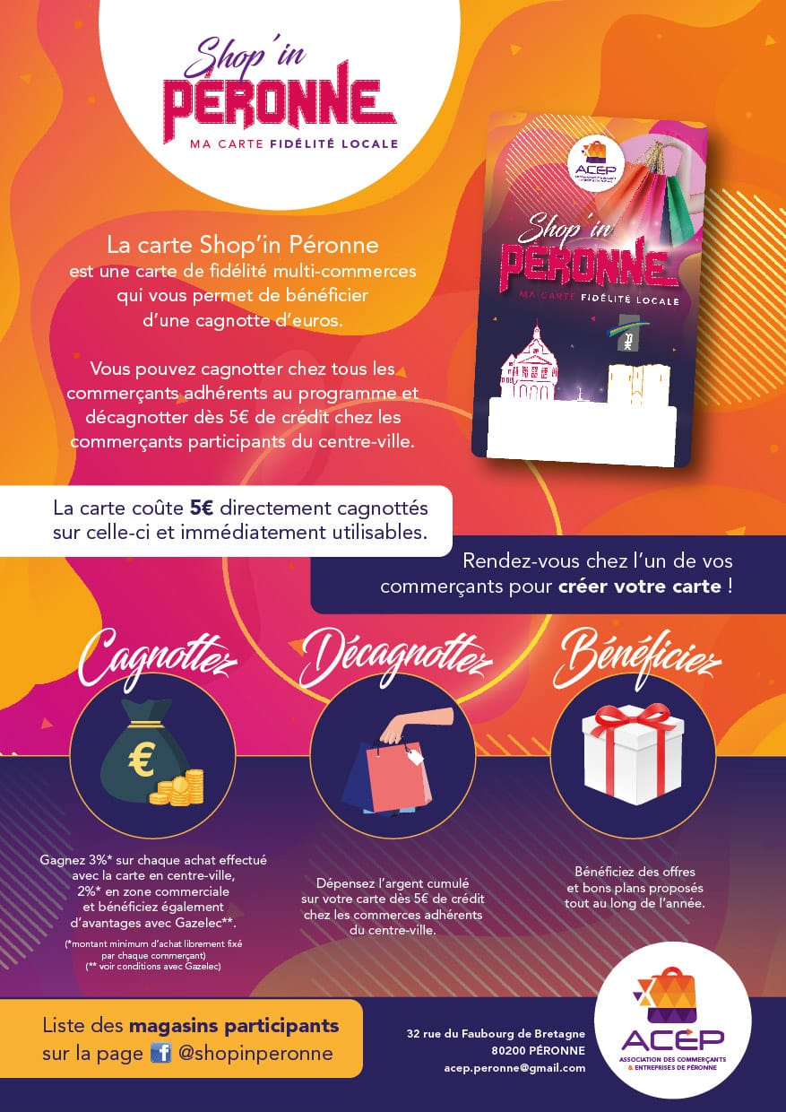 Sous l’impulsion de la municipalité, les commerçants de la ville de Péronne ont décidé de mettre en place une carte de fidélité multi-commerces, « Shop’in Péronne ». Cette carte de fidélité, dont la cagnotte est abondée par les achats en centre-ville et en zone commerciale, sera utilisable uniquement dans les commerces du centre-ville et ses points seront majorés lors d’achats réalisés chez les commerçants indépendants, regroupés en association (l’ACEP, Association des commerçants et entreprises de Péronne). Le projet, dont le lancement est imminent, est financé par Gazelec (la régie de gaz, électricité et eau de la ville) et par des commerces de la grande distribution (Intermarché, Leclerc …).
