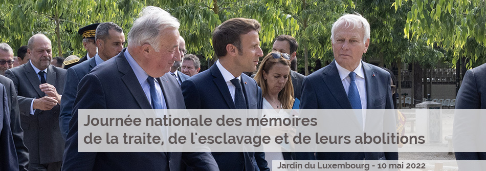 Le 10 mai 2022, Journée nationale des mémoires de la traite, de l'esclavage et de leurs abolitions, M. Gérard Larcher, Président du Sénat a accueilli M. Emmanuel Macron, Président de la République, pour la cérémonie d'hommage au Jardin du Luxembourg, en présence notamment de M. Jean-Marc Ayrault, ancien Premier ministre, Président de la Fondation pour la mémoire de l'esclavage (FME).