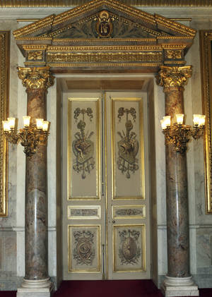 Chalgrin décore chacune des faces du salon de quatre avant-corps avec entablement posé sur deux colonnes de marbre à chapiteau composite. Chacun est surmonté d’un trophée et d’un buste antique, dont le fameux César de Pajou. L’architecte y expose également les statues de la Prudence, commandée à Deseine en 1802, et celle d’Harpocrate, dieu du silence, commandée à Mouchy avant la Révolution pour Louis XVI, et toujours en place dans le salon.
