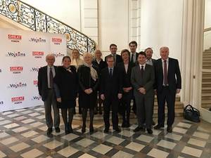 Les membres du groupe d'amitié France-Royaume-Uni avec M. Éric Bocquet, Président du groupe et S. E. Lord Edward Llewellyn, Ambassadeur du Royaume-Uni en France