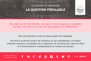 Après avoir entendu les ministres et les rapporteurs, le Sénat a examiné une motion déposée par le groupe CRC tendant à opposer la question préalable sur le texte (en savoir plus sur ces motions). Cette motion a été rejetée par 19 voix pour et 325 contre (voir le résultat du scrutin public ). Puis, les sénateurs ont procédé à la discussion générale. (Lire le compte rendu analytique - Lire le compte rendu intégral).