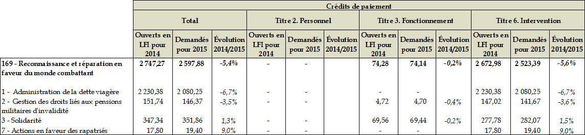 Le budget 2015 s'inscrit dans la même tendance que les années précédentes, à savoir une baisse des crédits d'intervention en raison d'une diminution des populations de pensionnés et retraités concernées, et ce, malgré les mesures nouvelles portées par le projet de loi de finances pour 2015 dont le montant s'élèverait à 3,6 millions d'euros en 2015 d'après les évaluations préalables du ministère de la défense. Trois de ces mesures font l'objet d'articles rattachés qui sont examinés séparément.