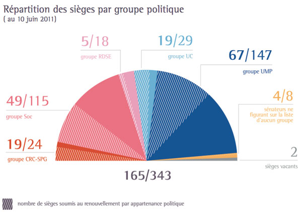 Pour être constitué un groupe politique doit comprendre au moins 15 sénateurs. Le Sénat compte aujourd'hui cinq groupes politiques: le groupe Communiste Républicain et Citoyen et des sénateurs du Parti de gauche (CRC SPG), le groupe Union Centriste (UC), le groupe Rassemblement Démocratique et Social Européen (RDSE), le groupe Socialiste (SOC), le groupe Union pour un Mouvement Populaire (UMP).