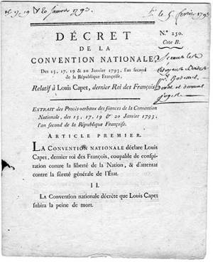 Un an plus tard, le 17 janvier 1793, la Convention vote la mort du Roi. Robespierre et Le Peleltier de Saint Fargeau votent pour l’exécution. En revanche, Condorcet comme l’Abbé Grégoire s’y opposent. Condorcet déclara : " La peine contre les conspirateurs est la mort. Mais cette peine est contre nos principes. Je ne la voterai jamais. ".