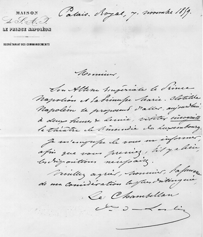 Palais-Royal, 7 novembre 1859 Monsieur, Son Altesse Impériale le Prince Napoléon et la Princesse Marie-Clotilde Napoléon se proposent d'aller, aujourd'hui, à deux heures et demie, visiter incognito le théâtre de l'incendie du Luxembourg. Je m'empresse de vous en informer, afin que vous preniez, s'il y a lieu, les dispositions nécessaires. Veuillez agréer, Monsieur, l'assurance de ma considération la plus distinguée. Le Chambellan Signé : illisible |
