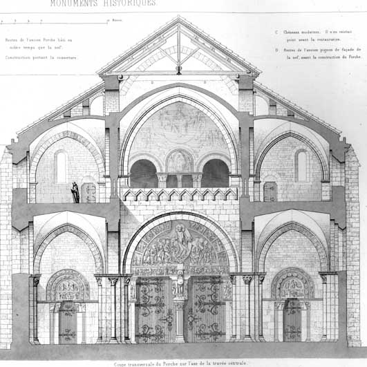 Église de Vézelay - coupe transversale du Porche sur l'axe de la travée centrale,