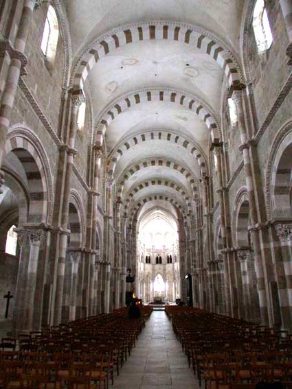 Malheureusement, les premiers architectes désignés manquent de motivation. Les premiers crédits - 6000 francs en 1835 et en 1838 - restent inutilisés. Mérimée décide alors, en 1840, de recourir au jeune Viollet-le-Duc. Celui-ci se met immédiatement au travail. En 1842, la restauration est, de l'avis de Mérimée « supérieurement commencée ». (lettre à L. Vitet, 3 juillet 1842). Il écrit : « j'ai passé une journée à Vézelay et j'ai vu avec grande joie que maintenant notre belle église est hors d'affaire. » Néanmoins il n'hésite pas à faire quelques reproches à son architecte favori, à propos notamment d'une « espèce de frise très compliquée et d'un caractère singulier » qu'il « a fait exécuter tout autour de l'église ». Il regrette cet ornement coûteux et inexistant à l'origine.