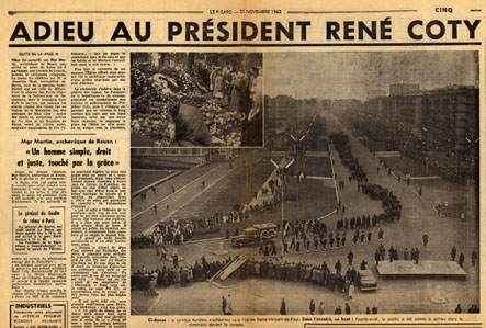 La ville du Havre lui organise des funérailles nationales. Un cortège de trois kilomètres l'accompagne vers sa dernière demeure et témoigne de la popularité et de l'affection que René Coty avait su susciter dans le cœur des Français.