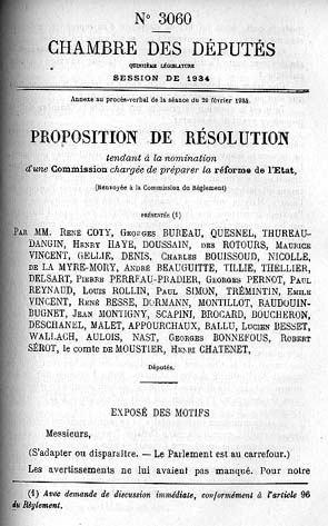 La proposition est adoptée le 15 mars 1934. Une commission de 44 membres est constituée. Elle choisit comme président Paul Marchandeau à une voix de majorité, jugeant René Coty trop réformateur. Cette commission fonctionnera jusqu'en 1936 date à laquelle Léon Blum mettra fin à ses travaux. De ses propositions ne sera retenue dans l'immédiat que la création d'un secrétariat général du gouvernement. Le vote des femmes et des militaires, la création d'un conseil supérieur de la magistrature et le renforcement de l'exécutif s'imposeront beaucoup plus tardivement.