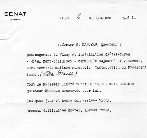 Note du Questeur Manceau sur le déménagement à Châtelguyon