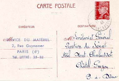 (JPG - 21 Ko) Le maintien du Sénat, même ajourné, implique le maintien de son administration. En 1940, celle-ci se trouve divisée en deux parties. Les assemblées doivent s'établir là où siège le Gouvernement. Par conséquent, des bureaux ont été installés d'abord à Vichy puis à Châtelguyon : ces services assurent les relations du Sénat avec les Sénateurs en zone libre et les ministères.