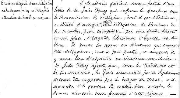 Extrait de la réunion de Questure du 5 avril 1892 concernant la couverture des frais occasionnés par l'envoi d'une délégation en Algérie, présidée par Jules Ferry