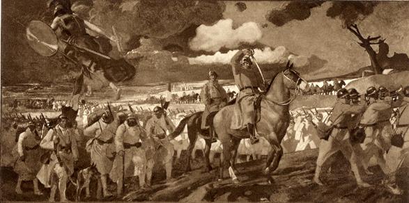 PAX IN VIRTUTE TUA Cette œuvre de Lucien SIMON (1861-1945) fait partie d'un décor commandé au peintre et destiné à un escalier du Palais du Luxembourg. Il comprend quatre toiles de grand format, marouflées au mur. Le plafond est l'œuvre de Maurice DENIS. Lors de son inauguration le 28 février 1929, le Questeur du Sénat Joseph MONSSERVIN relève que le « pinceau prestigieux de LUCIEN SIMON est tenu par la main d'un artiste scrupuleux et guidé par le cerveau d'un fin psychologue. Nul mieux que lui ne pouvait parler sur la toile cette langue sacrée et éternelle de l'art, seule digne de l'histoire ». Au sujet de l'oeuvre, il juge que « Réunir sur une même toile les dernières convulsions de la guerre et la première heure de la paix était chose difficile. Lucien Simon a su donner à ce sujet, toute l'ampleur, toute la vigueur qu'il comporte. « Dans un cortège de nuages livides, aux formes monstrueuses, Bellone s'enfonce dans le couchant sinistre. A travers le morne champ de bataille, les survivants se regroupent, les batteries se reforment et nos fantassins, derrière le chef qui remet l'épée libératrice au fourreau, abandonnent enfin la tranchée de mort. « Qui ne mettrait un nom sur chacune de ces physionomies si expressives, un souvenir sur chacun de ces gestes si vrais ? « Peu nombreux hélas ceux qui vont revoir leur clocher. Dans les fouillis des fils de fer, à côté des arbres squelettiques, on devine les croix de bois ; c'est à leurs morts maintenant qu'est confiée la garde de la Terre sacrée. » |
