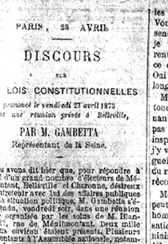 (…) Voyez ces communes éveillées à la vie politique, se groupant, se réunissant, se renseignant, s’informant, délibérant, déléguant leurs hommes ; ceux-ci s’assemblant au chef-lieu du département, faisant prévaloir leurs volontés, lesquelles seront, le jour de l’élection, ce qu’elles auront été la veille. Après la délibération commune, que va-t-il sortir des urnes ? Un Sénat ? Non, citoyens, il en sortira le Grand Conseil des Communes françaises. (Applaudissements).