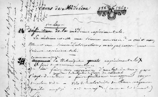 Manuscrit du cours de médecine expérimentale de Claude Bernard au Collège de France (1868-1869)
