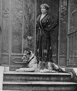 Marguerite Durand et sa jeune lionne, baptisée "Tigre", qu'elle élève dans le jardin de son petit hotel, près du