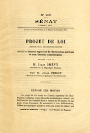 (GIF - 148 Ko)Le projet de loi de Jules Ferry, ministre de l'instruction publique, relatif au Conseil supérieur de l'instruction publique et aux conseils académiques est transmis au Sénat le 22 juillet 1879. Il fait l'objet d'un rapport présenté par Jules Barthélemy Saint-Hilaire et publié au Journal officiel du 7 février 1880 (n° 4). Ce projet est discuté pendant neuf jours devant la Haute Assemblée. Il est adopté le 2 février 1880. Une seconde délibération se déroule dix jours plus tard pour se terminer le 16 février 1880 par une adoption avec modification.