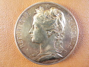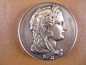 • Avers : REPUBLIQUE FRANCAISE. Buste de la République, de profil à droite, coiffée du bonnet phrygien, les épaules couvertes d'une draperie. A gauche, dans le champ, une branche d'olivier.