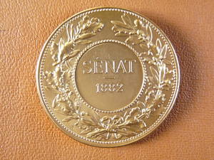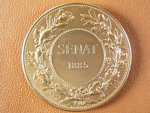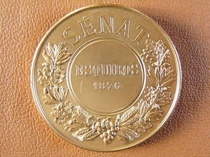 • Revers : SENAT. Un livre ouvert, sur lequel on lit : LOI 24 FEVRIER, 2 AOUT 1875 ; LOI 13-24 AOUT, 9 DECEMBRE 1884, est posé sur une branche de chêne. Devant, un cartouche destiné à recevoir le nom du sénateur ainsi que le millésime de 1897