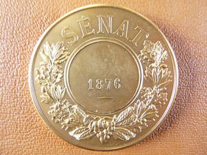 • Revers : Deux branches de chêne et d'olivier alternées, liées par un ruban et formant couronne. Au centre, dans un cercle perlé : SENAT, et un emplacement pour le nom du sénateur. Au-dessous : 1882