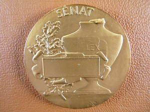 Médaille d'identité du Sénat de la Troisième République, 1900 (argent doré). A/ REPUBLIQUE FRANCAISE. Buste de la République, de profil à droite, coiffée du bonnet phrygien, les épaules couvertes d'une draperie. Au-dessous, une branche d'olivier. R/ SENAT. Devant une branche de chêne et une urne, d'où sort un bulletin de vote et sur laquelle sont représentées les tables de la loi avec l'inscription : LEX, un cartouche destiné à recevoir le nom du sénateur, ainsi que le millésime de 1900 (Di Stefano, p. 82 bas). 1900.