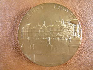 Médaille d'identité du Sénat de la Troisième République, 1909 (argent doré). A/ REPUBLIQUE FRANCAISE. La République, enveloppée dans les plis d'un drapeau, plane au-dessus de la salle des séances du Sénat. R/ SENAT 1909. Le Palais du Luxembourg, vu des jardins. Au-dessous, un cartouche destiné à recevoir le nom du sénateur (Di Stefano, p. 85 haut). 1909.