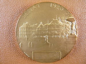 Médaille d'identité du Sénat de la Troisième République, 1920 (argent doré). A/ REPUBLIQUE FRANCAISE. La République, enveloppée dans les plis d'un drapeau, plane au-dessus de la salle des séances du Sénat. R/ SENAT 1920. Le Palais du Luxembourg vu des jardins. Au-dessous, un cartouche destiné à recevoir le nom du sénateur (Di Stefano, p. 86). 1920.