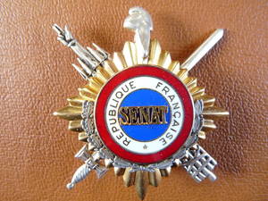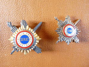 Insigne de sénateur de la Cinquième République : un faisceau de la République, surmonté d'une main de Justice, et un glaive, entrecroisés et ornés au centre d'une cocarde tricolore avec les inscriptions SENAT et REPUBLIQUE FRANCAISE ; sur le haut, un bonnet phrygien. 1958.