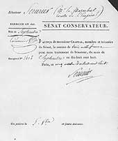 Il s'abstient lors du vote de la déchéance de Napoléon au Sénat, se rallie à Louis XVIII qui le fait Pair de France, puis sert à nouveau Napoléon durant les Cent-Jours.