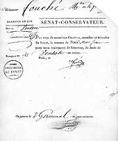 "Le citoyen Fouché, ministre de la police dans des circonstances difficiles, a répondu par ses talents et par son activité, par son attachement au gouvernement, à tout ce que les circonstances exigeaient de lui. Placé dans le sein du Sénat, si d'autres circonstances redemandaient encore un ministre de la police, le gouvernement n'en trouverait point un qui fût plus digne de sa confiance." (Napoléon)