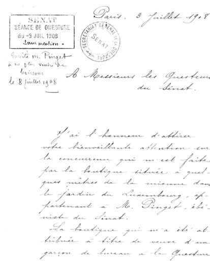 Le jardin du Luxembourg compte parmi les plus grands parcs de la capitale. Pour autant, les boutiquiers s'y sentent parfois serrés et pestent contre leurs concurrents. En 1908, par exemple, une marchande de friandises demande aux Questeurs de rappeler à son voisin immédiat, propriétaire d'une bascule pour peser les enfants, qu'il n'a jamais été autorisé à vendre des gâteaux, des sirops et des sucres d'orge dont le négoce porte préjudice à son propre commerce.