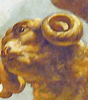 SEPTIÈME TABLEAU : le Bélier (Mars). – Mois où les arbres bourgeonnent. – Mars, armé de pied en cap, tenant d’une main son épée, de l’autre secouant le flambeau de la guerre, descend du haut des rochers ; un berger est près de lui qui joue de la cithare ; un bélier le suit. Mars indique que ce mois est celui où les armées se mettent en campagne ; le berger et le bélier, que le retour du printemps fait sortir les troupeaux des bergeries.