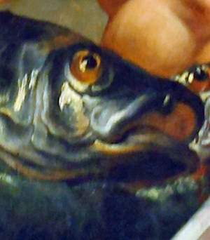 SIXIÈME TABLEAU : les Poissons (Février). – Vénus Anadyomène et l’Amour armé de son arc, portés par des dauphins se promènent sur les eaux que les vents agitent avec violence. Vénus et son fils sont occupés à retenir les légères draperies qui les couvrent. L’agitation de la mer et les poissons indiquent que ce mois est celui des grands vents et de la pêche.