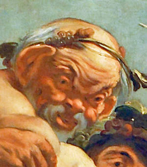 DEUXIÈME TABLEAU : le Scorpion (Octobre). – Bacchanale ou fête de Bacchus. Un jeune satyre porte sur ses épaules le vieux Silène pris de vin et tenant une grappe de raisin ; ils sont tous deux couronnés de pampres. Une bacchante les suit en jouant du tambour de basque. La bacchanale désigne que dans ce mois les vignerons se réjouissent et se délassent de leurs travaux en goûtant les nouveaux fruits de la vendange. Le scorpion, que l’on voit dans la bordure, fait allusion à la malignité des maladies causées par les vents humides, chargés de vapeurs dangereuses, qui se font sentir alors.