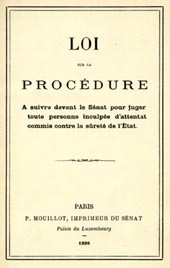 (JPG - 26 Ko)L'article 12 de la loi du 16 juillet 1875 apporte une précision complémentaire en stipulant que la mise en accusation du Président de la République et des ministres relève de la compétence de la Chambre des députés. Il dispose encore qu'un décret du Président de la République, rendu en Conseil des ministres, est nécessaire pour constituer le Sénat en Cour de justice dans les cas d'attentat contre la sûreté de l'État.