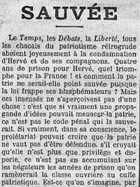 "Ce manuscrit est celui de l’article paru sous le même titre dans L’Humanité du 1er janvier 1906 et repris par La Cité, quotidien socialiste de Toulouse, le 3 du même mois. Jaurès y dénonce avec beaucoup d’âpre ironie la condamnation le 30 décembre précédent de Gustave Hervé à quatre ans de prison pour provocation de militaires à la désobéissance après avoir signé une affiche antimilitariste de l’Association Internationale Antimilitariste invitant les conscrits à la rébellion (« grève immédiate » et « insurrection ») en cas de guerre. Hervé effectue six mois de prison, de février à juillet 1906, bénéficiant d’une amnistie, mais il est condamné à nouveau pour des motifs analogues en 1907, 1910, 1911 et 19121. Au-delà du cas Hervé se pose toute la question de l’antimilitarisme et de l’action possible des socialistes contre le risque de guerre dans le cadre et en dehors de l’Internationale, discutée dans les congrès du parti socialiste et de l’Internationale2".
