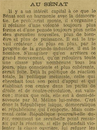 Pour conserver cette modération du Sénat mais en corriger l’aspect conservateur, Jaurès plaide en 1889 et 1890 pour une « chambre du travail » qui le remplacerait. En 1896 Jaurès réagit vivement lors de la chute du gouvernement de Léon Bourgeois renversé sur le dossier de l’impôt sur le revenu par le Sénat, mais il se félicite par la suite du rôle courageux joué par le Sénat lors de l’Affaire Dreyfus. Dans l’article de 1903, Jaurès souligne le risque de défiance du prolétariat face à une institution « oligarchique et étroite qui fasse obstacle au suffrage universel ». Si Jaurès accepte une forte représentation des communes rurales – en républicain et en socialiste, il sait bien l’enjeu de la conquête des campagnes pour l’établissement définitif de la République -, il se plaint d’une sous-représentation des forces ouvrières. Dans cet article Jaurès n’appelle donc pas à la suppression du Sénat mais à la poursuite de sa transformation en tirant les leçons des crises traversées victorieusement par la IIIe République : « Il était il y a vingt-cinq ans la forteresse de la réaction. Il est devenu, contre la réaction, contre le boulangisme, contre le nationalisme, contre le cléricalisme, et aussi contre le mélinisme, une forteresse de la République. En ce sens, le progrès est immense, et il n’a pas été obtenu par des coups de force et des mouvements de la rue, mais par l’action légale, par l’influence grandissante et l’infiltration continue de la démocratie. Maintenant, c’est dans l’ordre des questions économiques et sociales qu’il faut faire la conquête du Sénat. »".Alain Chatriot, « Jaurès face au Sénat. La Chambre haute : problème ou solution pour les socialistes et les républicains », Cahiers Jaurès, 2004/4 (N° 174), p. 39-52.