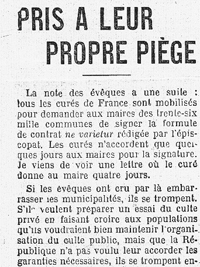 Pour l’heure, la discussion tourne sur l’application de la loi du 2 janvier 1907 sur « l’exercice public des cultes ». Dans cet article, Jaurès répond à la proposition de contrat décidée en réponse par l’assemblée des évêques de France réunie au château de La Muette où réside désormais l’archevêque de Paris3. Jaurès donne les conseils les plus pratiques aux municipalités pour y répondre et permettre l’exercice du culte tout en préservant les intérêts de la puissance publique. Si finalement le contrat-type demandé par les évêques ne sera pas adopté, l’organisation du culte pourra continuer sans difficultés majeures4. Jaurès se montre favorable à une évolution libérale de la loi sur les réunions publiques afin de supprimer la nécessité de la déclaration préalable, ce qui sera acquis par la loi du 28 mars 1907. Cet article constitue une leçon de laïcité concrète, volontairement détachée des divergences de principes s’exprimant au sein de la majorité républicaine. Au-delà, il n’est pas non plus impossible d’y déceler un début de prise de conscience qu’un des effets de la loi pourrait être de renforcer le pouvoir de la hiérarchie catholique sur son clergé."