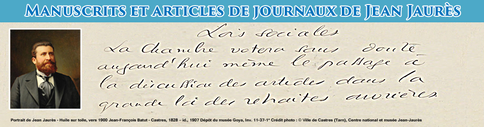 "Ce manuscrit est celui de l’article paru sous le même titre dans L’Humanité du 20 septembre 1905. Un article ironique, à la fin des vacances scolaires et parlementaires de l’été 1905, lorsque Jaurès constate l’affaiblissement de la pensée catholique, qui ne mobilise plus vraiment contre la loi de Séparation, et son remplacement comme ossature du conservatisme par le nationalisme avec toutes les polémiques qui ont eu cours dans les semaines précédentes autour de l’idée de patrie et de l’antipatriotisme réel ou supposé des syndicalistes révolutionnaires et de certains socialistes comme Gustave Hervé. Il n’est néanmoins pas impossible de déceler derrière l’ironie du directeur de L’Humanité un peu de nostalgie et de connivence avec l’espérance universelle professée par le catholicisme. Le quadrige patriotisme-internationalisme-catholicisme-socialisme ne se laisse pas si facilement réguler ou enfermer dans des formules trop simples et étroites. Faut-il ajouter que les controverses, avec quelques rencontres et beaucoup de dissentiments, entre Albert de Mun (1841-1914) et Jean Jaurès (1859-1914) structurent une bonne part de la vie politique de la Troisième République ? Ce fut très volontairement que leurs bustes furent choisis pour marquer le passage de la salle des colonnes à l’hémicycle au sein du Palais-Bourbon1 , jusqu’à ce que récemment Olympe de Gouges ne remplace l’ancien député du Morbihan et du Finistère."