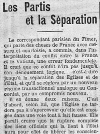 Son article s’insère dans une discussion de presse élargie : outre le Times, il évoque les notes rédigées par Henri des Houx [Henri Durand-Morimbau] et publiées sous le titre « France et Saint-Siège » par Le Matin des 2, 3 et 5 août 1904 ainsi que l’article d’Albert de Mun, « La rupture », paru dans La Croix du 3 août 1904 comme l’explique dans son annotation de 2015 l’historienne Jacqueline Lalouette et celui, non signé comme il est de tradition dans ce journal, du Temps : « Le lendemain » (5 août 1905)".1Voir Jacqueline LALOUETTE, La séparation des Églises et de l’État. Genèse et développement d’une idée. 1789-1905, Paris, Seuil, « L’univers historique », 2005.