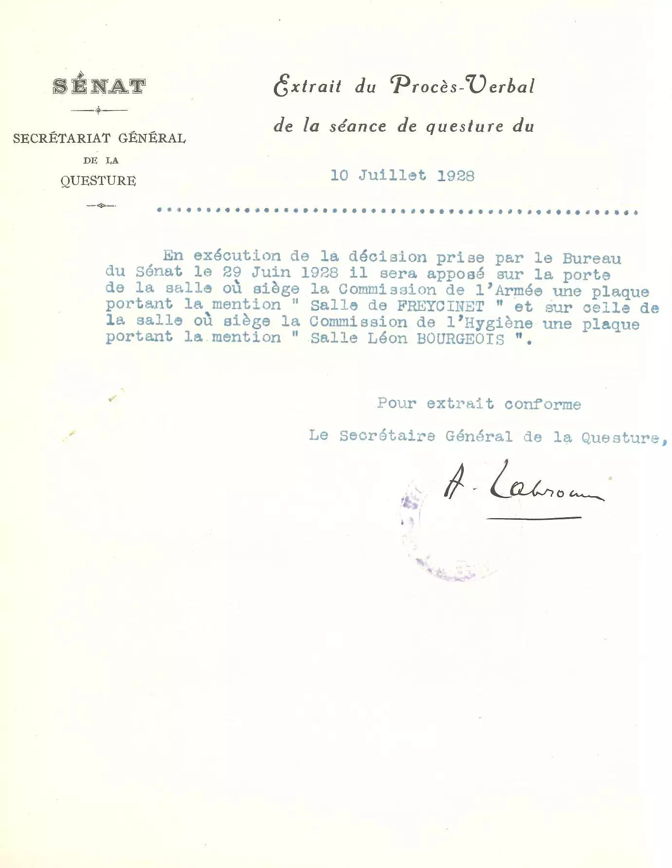 En 1928, le Sénat décide de rendre hommage à Léon Bourgeois en donnant son nom à une des salles du Sénat et en y faisant apposer une plaque.