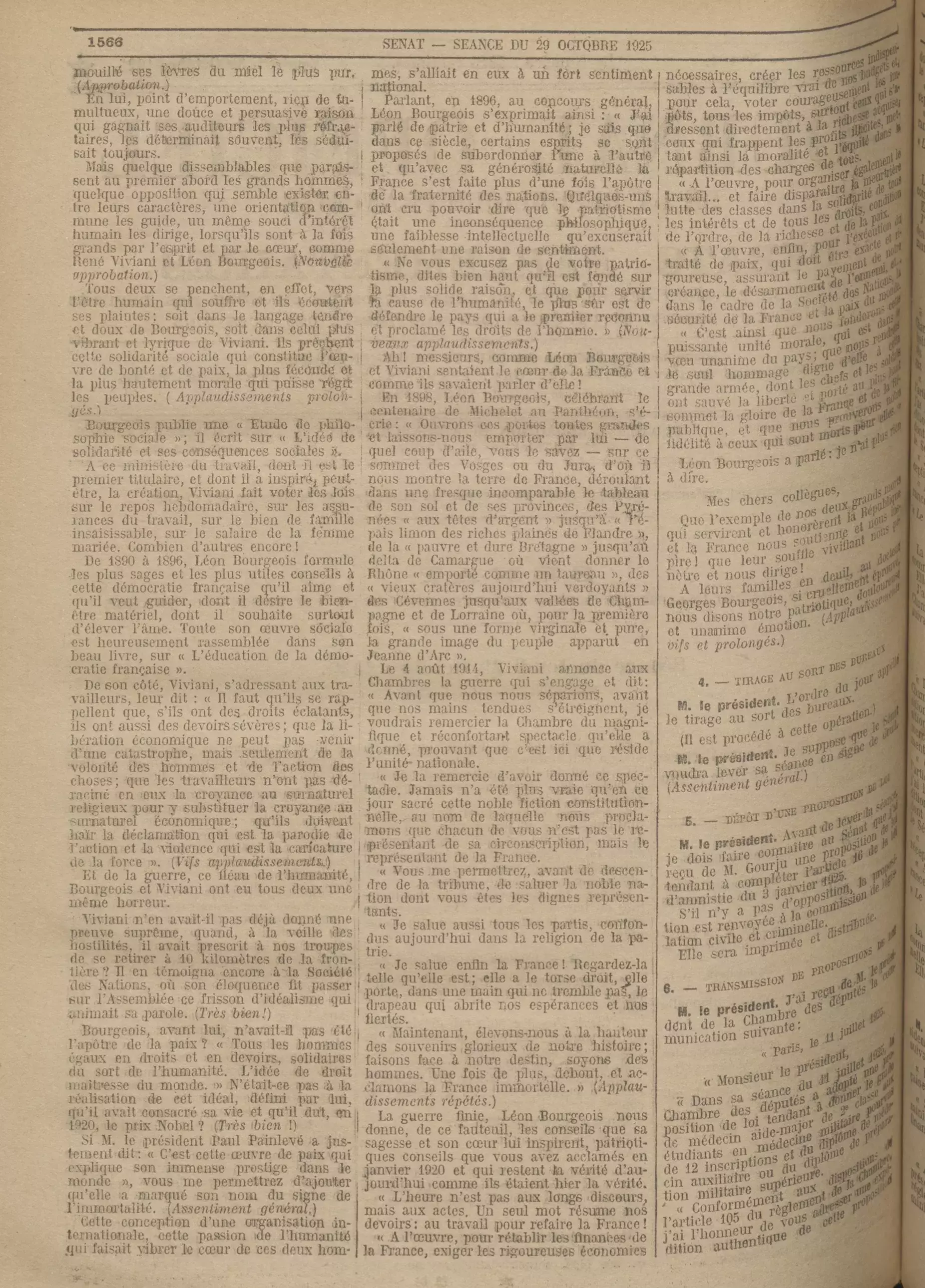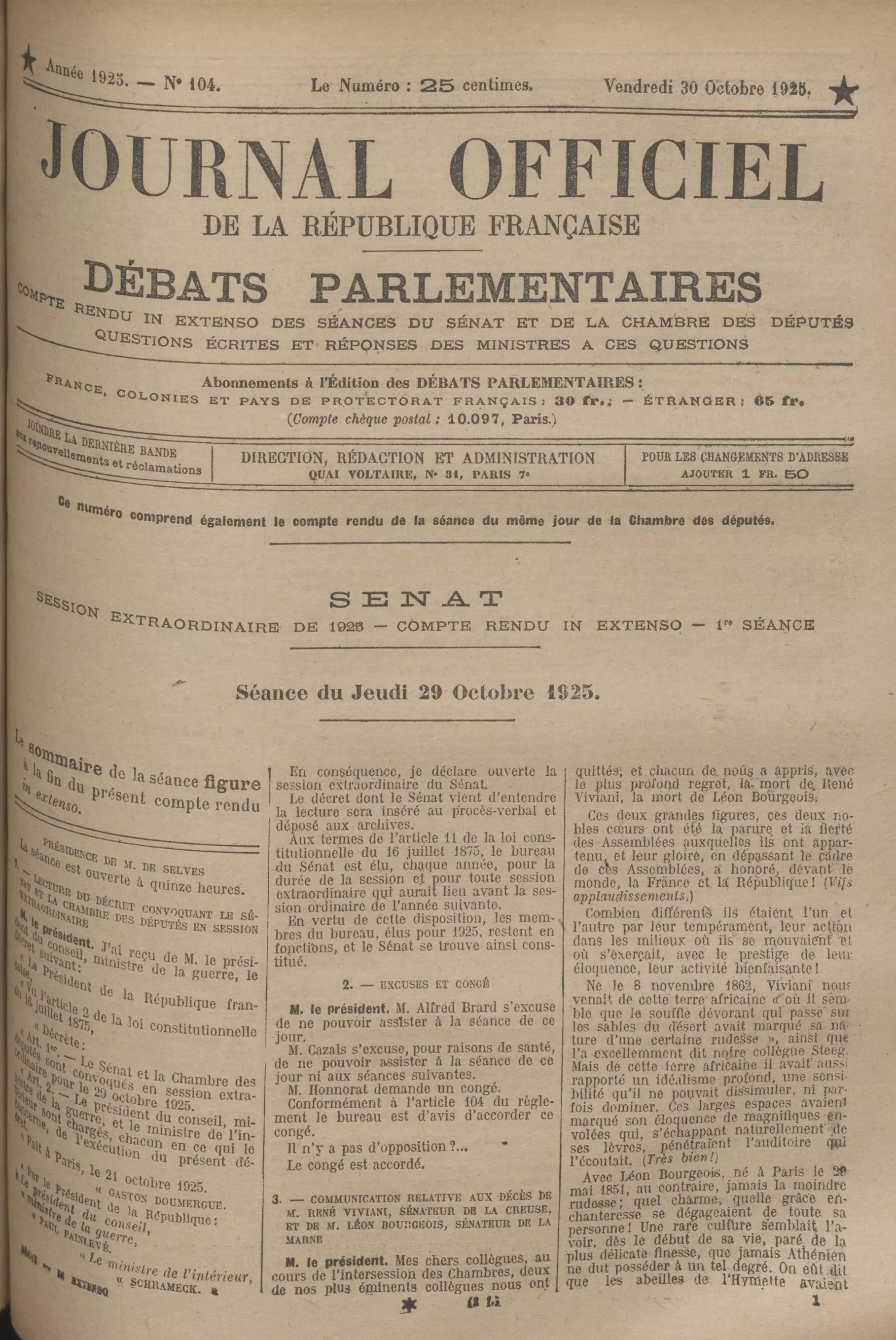 "M. le président. Mes chers collègues, au cours de l'intersession des Chambres, deux de nos plus collègues nous ont quittés, et chacun de nous a appris, avec le plus profond regret, la mort de René Viviani, la mort de Léon Bourgeois.