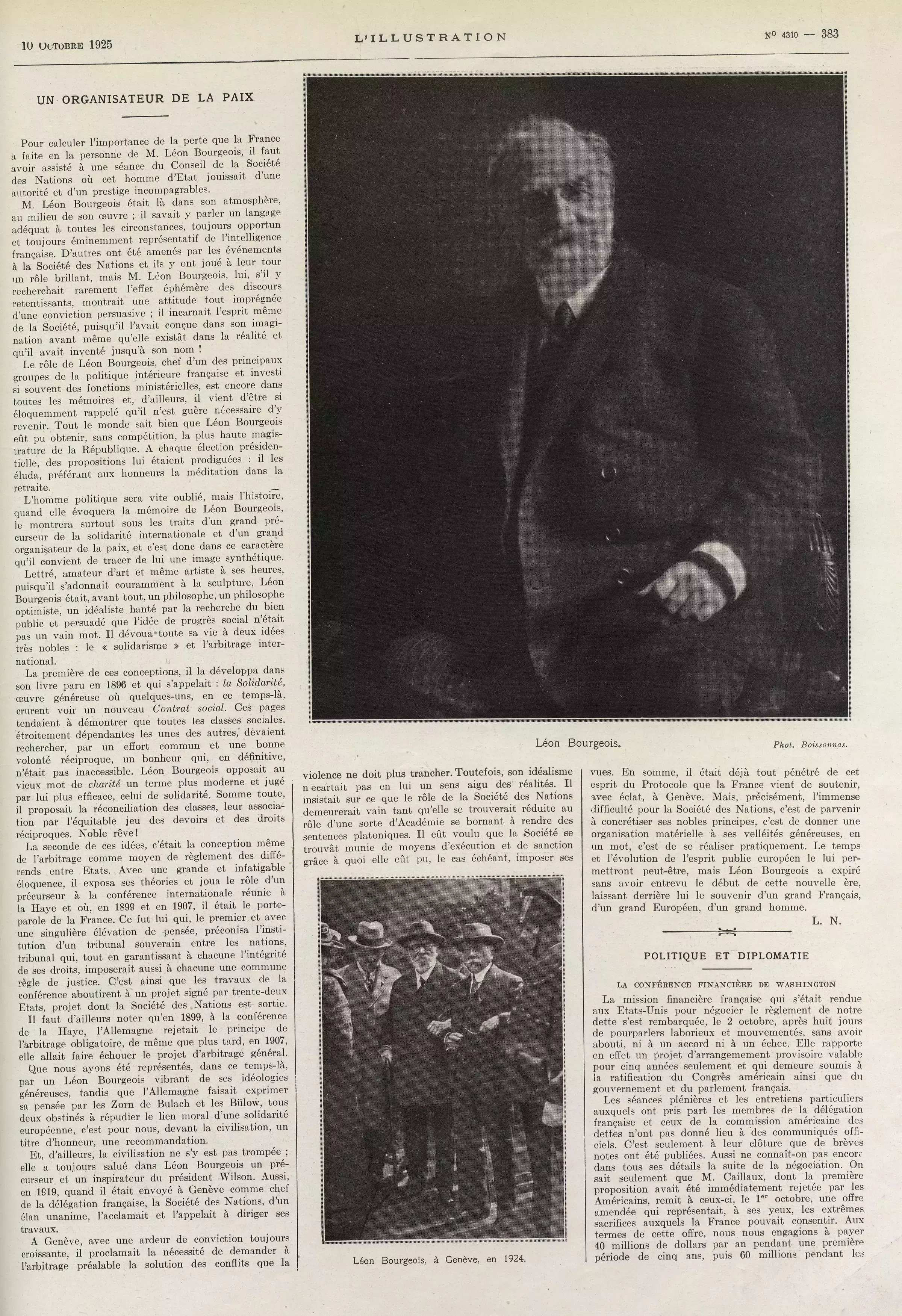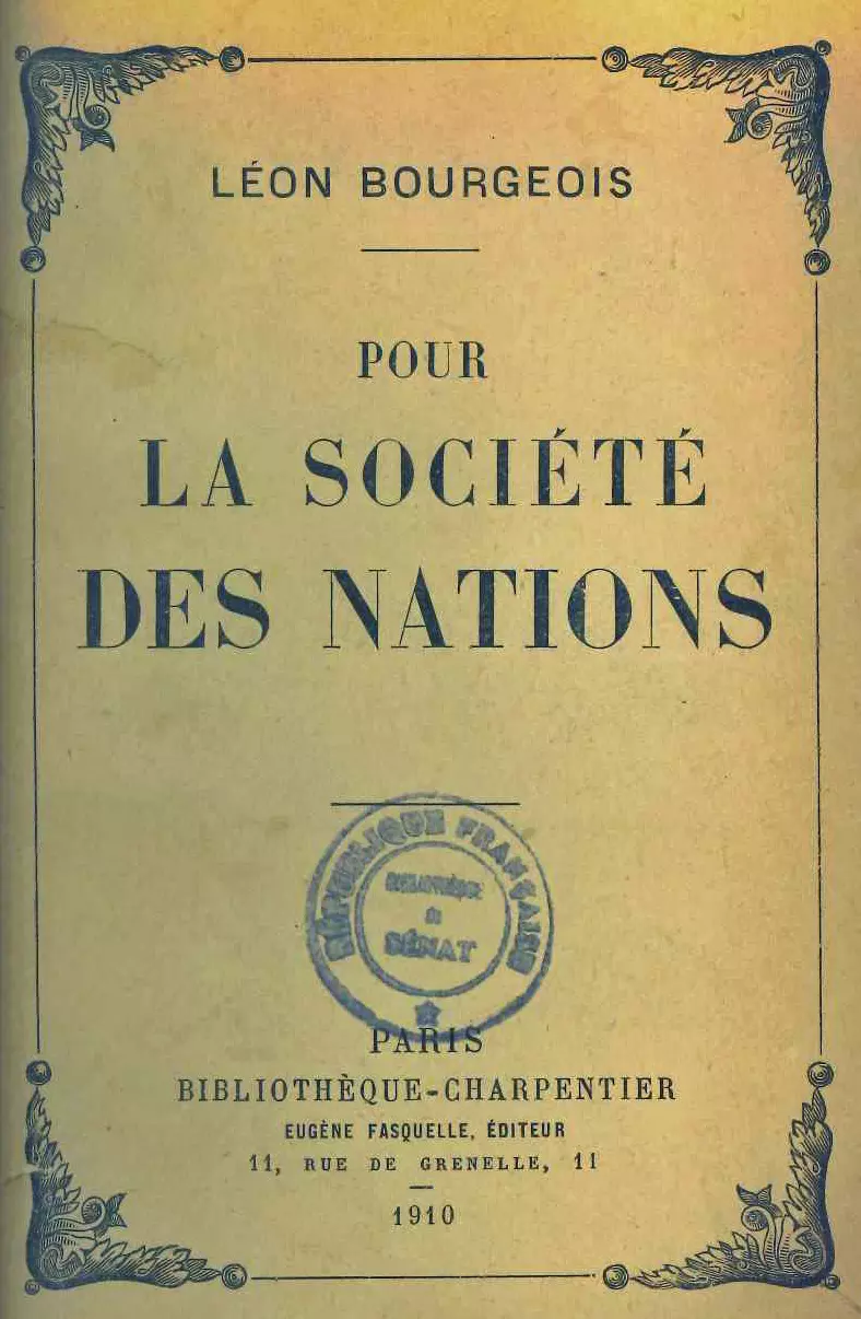 Après la Grande Guerre, les idées de Léon Bourgeois trouvent un aboutissement avec la signature du pacte de la Société des Nations, le 28 juin 1919, lors de la Conférence de la Paix à Paris. Il y consacre un opuscule où il indique :