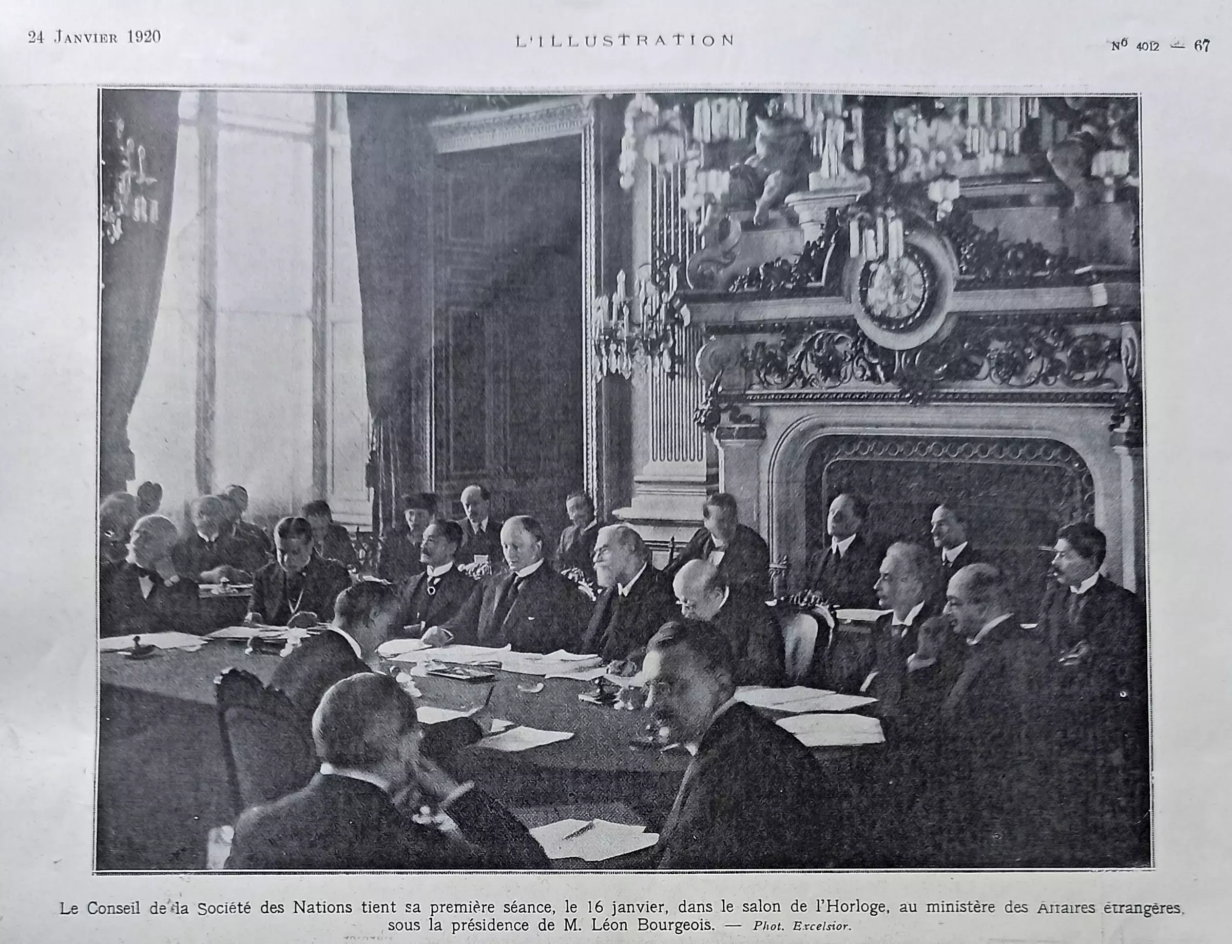 Le 16 janvier 1920, le Conseil de la Société des Nations tient sa première réunion au Quai d’Orsay, sous la présidence de Léon Bourgeois.