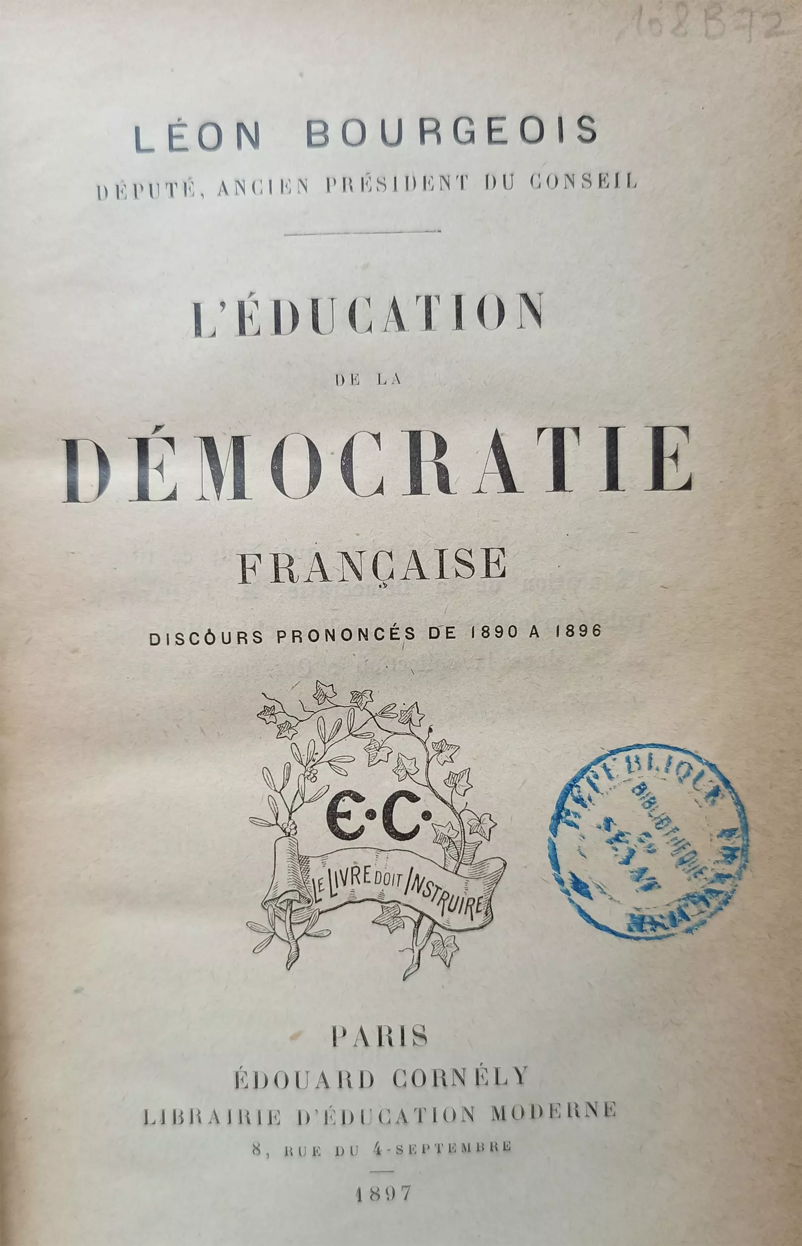 - Léon BOURGEOIS, L'éducation de la démocratie française [Texte imprimé] : discours prononcés de 1890 à 1896, Paris : E. Cornély, 1897, 288 p.