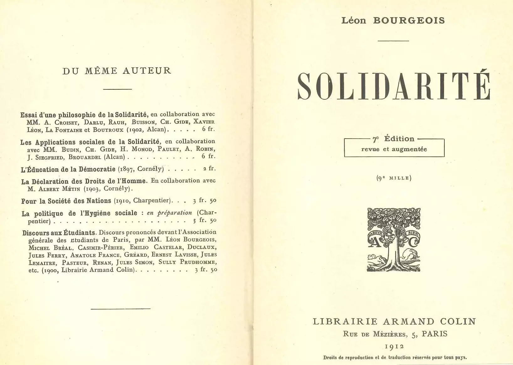 - Léon BOURGEOIS, Solidarité, Paris, Armand Colin, 1912, 294 p.