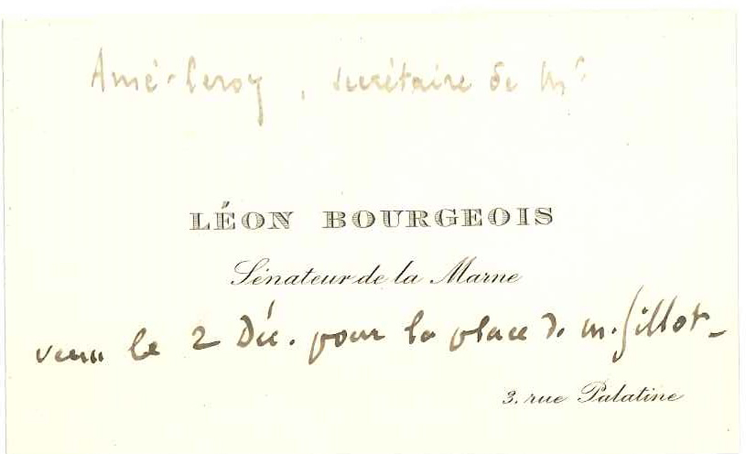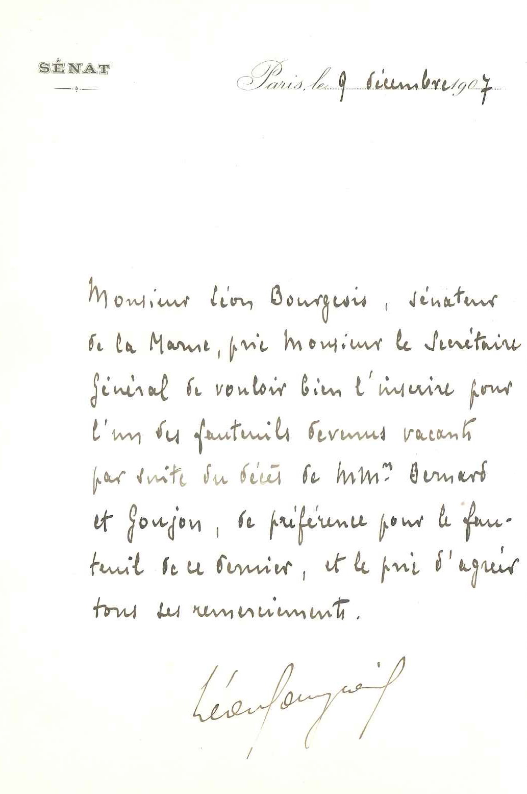 Monsieur Léon Bourgeois, sénateur de la Marne, prie Monsieur le Secrétaire Général de bien vouloir l'inscrire pour l'un des fauteuils devenus vacants par suite du décès de MMrs Bernard et Goujon, de préférence pour le fauteuil de ce dernier [...]