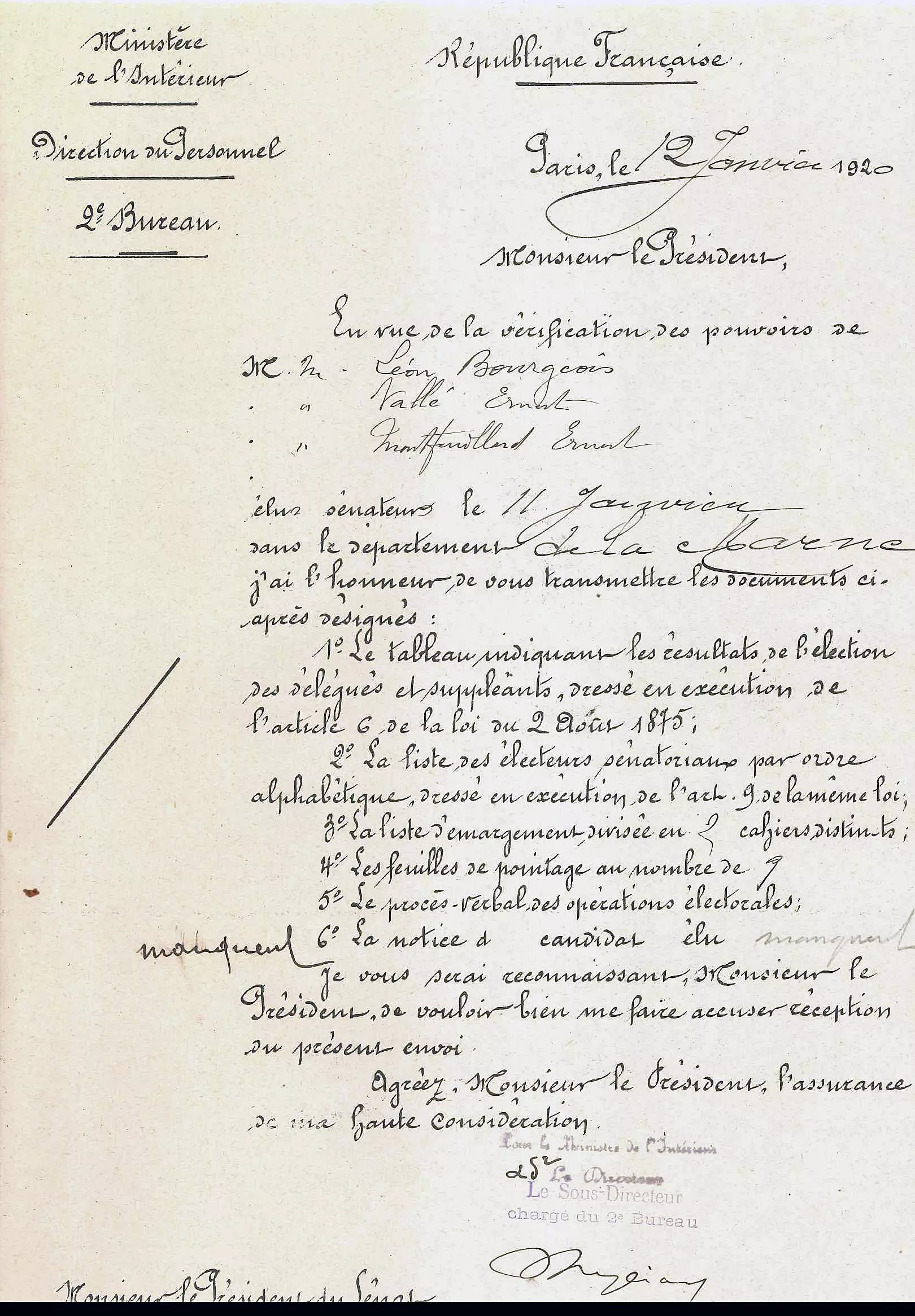 Le 14 janvier 1920, Léon Bourgeois est élu Président du Sénat au troisième tour de scrutin par 147 voix contre 125 à Antonin Dubost, Président sortant.
