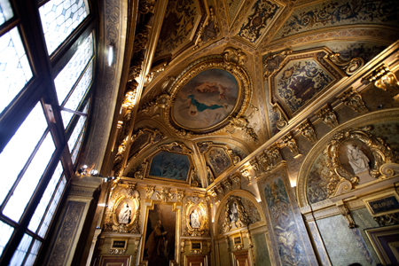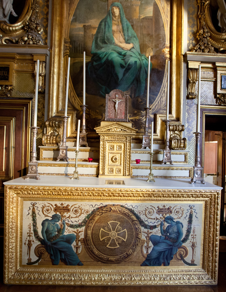 La table d'autel réutilise un panneau peint à figure en camaïeu, provenant certainement de la même série que ceux de la salle du Livre d'Or.