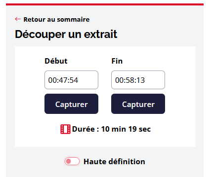 Le module de découpe permet de choisir la qualité de la vidéo (qualité normale ou haute définition) et de nommer l’extrait.